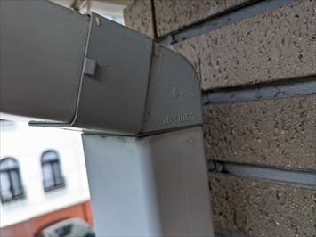 既存の雨樋を確認していくと、エルボのジョイント部分から雨水が流れ出てしまっているようでした。また、竪樋は旧National(現Panasonic)のn2.5という規格のもので、現在ではリモデルがありn3.5という規格に代わってしまっております廃盤となっております。